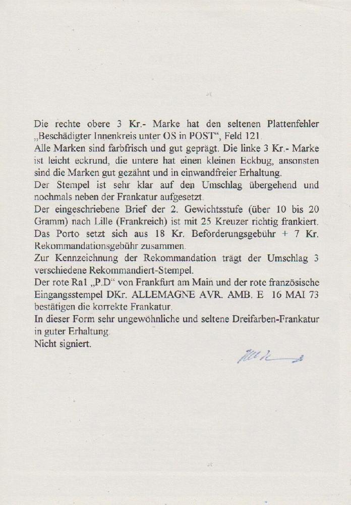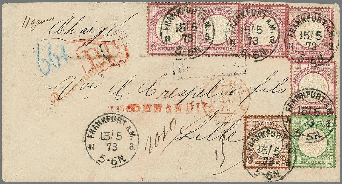 | Zusatzinformationen und Suchstichworte: | Rauhut & Kruschel - 212. Auktion Auktionstermin: 30. Juli 2022 Los 2563 Deutsches Reich 1 Kr. grün, 3 Kr. rosa per fünf (rechte obere Marke seltener Plattenfehler III von Feld 121) und 9 Kr. rotbraun auf Einschreibebrief der 2. Gewichtsstufe von Frankfurt/M. (K1) 1873 nach Lille/Frankreich. Die linke obere 3 Kr. min. "eckrund", rechte untere kleiner Eckbug, sonst tadellos. Eine sehr ungewöhnliche, möglicherweise sogar einmalige Frankatur-Kombination. Attest Krug Ausruf 3.500,00 EUR |