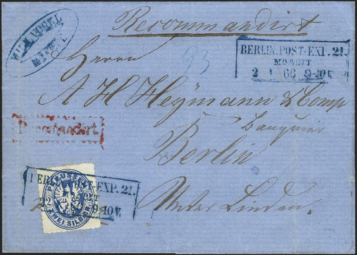 | Zusatzinformationen und Suchstichworte: | 378. Auktion Heinrich Köhler Auktionstermin 21.-26. März 2022 Los 167 2 Silbergroschen ultramarin, farbfrisch und gut durchstochen, mit blauem Rahmenstempel "BERLIN POST-EXP.21. MOABIT 2 1 66“ auf eingeschriebener Ortsbriefhülle mit nebengesetztem roten Zackenkranzstempel „Rekomandirt“. Schöne und einwandfreie Erhaltung. Signiert Kruschel und Metzer, Fotoattest Jäschke-Lantelme BPP (2021) Ausruf 200,00 EUR Zuschlag 200,00 EUR (aus der Sammlung Erivan Haub) |