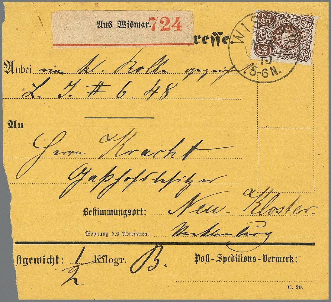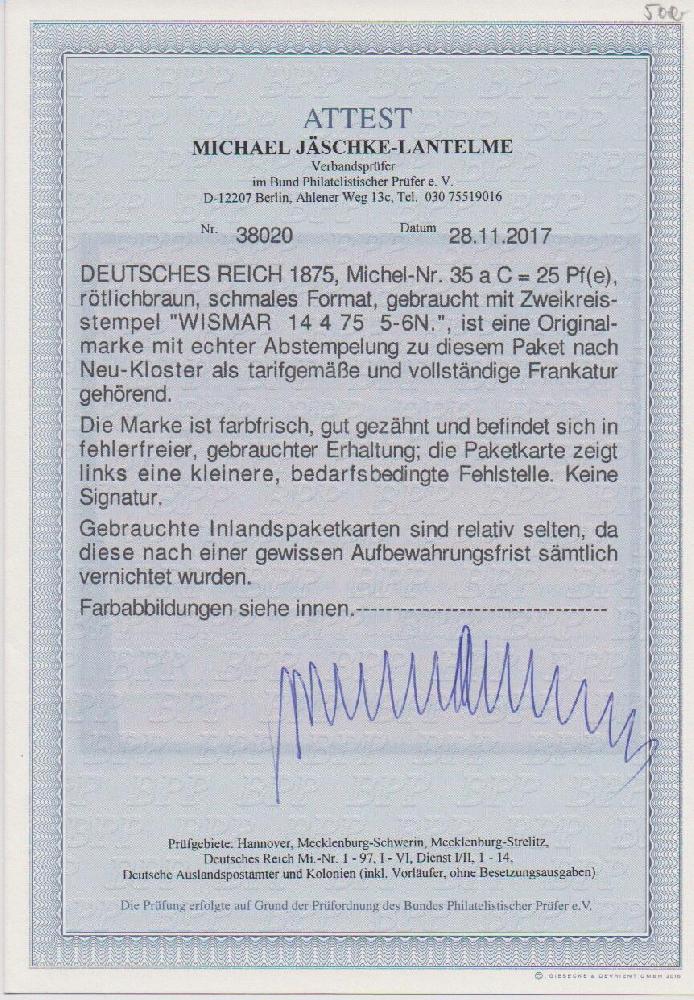 | Zusatzinformationen und Suchstichworte: | Rauhut & Kruschel - 212. Auktion Auktionstermin: 30. Juli 2022 Los 2587 Deutsches Reich 25 Pfge. rötlichbraun, schmales Format, tadellos, als Einzelfrankatur auf Inlands-Paketkarte (links etwas schräg getrennt) von Wismar 1874 nach Neukloster. Ungewöhnliche Verwendung und selten, da Inlands-Paketkarten sämtlich vernichtet werden sollten. Attest Jäschke-L. Ausruf 220,00 EUR |