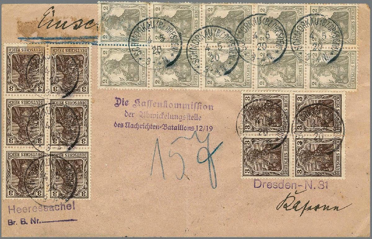 | Zusatzinformationen und Suchstichworte: | Rauhut & Kruschel - 212. Auktion Auktionstermin: 30. Juli 2022 Los 2620 Deutsches Reich 3 Pfg. schwarzockerbraun, gute Farbe des Kriegsdrucks, Vierer- und Sechserblock (hier unteres Paar leicht tintenfleckig), nebst 2 Pfg. im Zehnerblock, auf R-Brief (R-Zettel abgefallen) aus Schmorkau 1920. Ein Brief mit zehn Exemplaren Nr. 84IIb ist selten! Attest Jäschke-L. Mi. 1450,- + Ausruf 220,00 EUR |