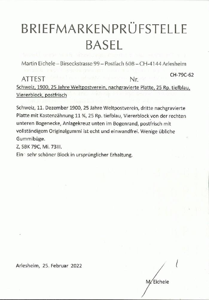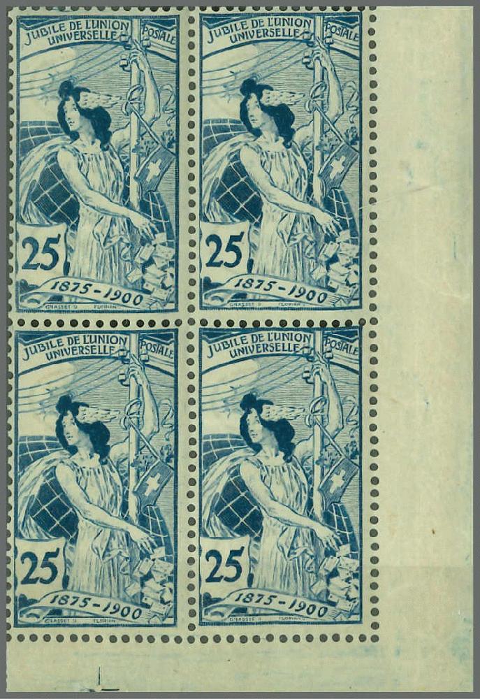 | Zusatzinformationen und Suchstichworte: | Rapp Auktion 2022 Auktionstermin: 2. - 7. Mai 2022 Los 247 Schweiz Weltpostverein Jubiläums-Ausgaben 1900 5 Rp. bis 25 Rp., nachgravierte Platte, 3 Werte in postfrischen Viererblöcken, der Höchstwert aus der rechten unteren Bogenecke und mit wenigen, geringen Gummibügen. Attest Eichele. Zuschlag 2.100,00 CHF |