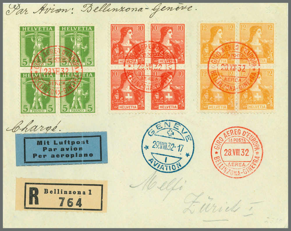 | Zusatzinformationen und Suchstichworte: | Rapp Auktion 2022 Auktionstermin: 2. - 7. Mai 2022 Los 253 Schweiz Freimarken nach 1907 Tellknabe 5 Rp. grün und Helvetia-Brustbild 10 Rp. rot und 12 Rp. ockergelb, zusammen auf eingeschriebenem Luftpost-Brief nach Zürich mit zentrisch aufgesetzten roten Sonder-Stempeln "GIRO AERO D'EUROPA 28.VIII.32 AERA BELLINZONA-GINEVRA". Ein attraktiver Brief in bester Erhaltung. Atteste Rellstab und Liniger. Zuschlag 360,00 CHF |