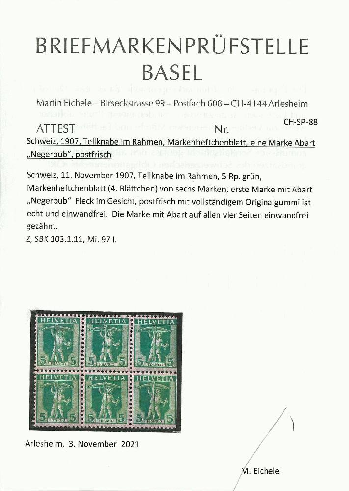 | Zusatzinformationen und Suchstichworte: | Rapp Auktion 2022 Auktionstermin: 2. - 7. Mai 2022 Los 255 Schweiz Freimarken nach 1907 5 Rp. grün, postfrischer 6er-Block aus Markenheftchen, die linke obere Marke mit Abart "Negerbub". Attest Eichele. Zuschlag 420,00 CHF |