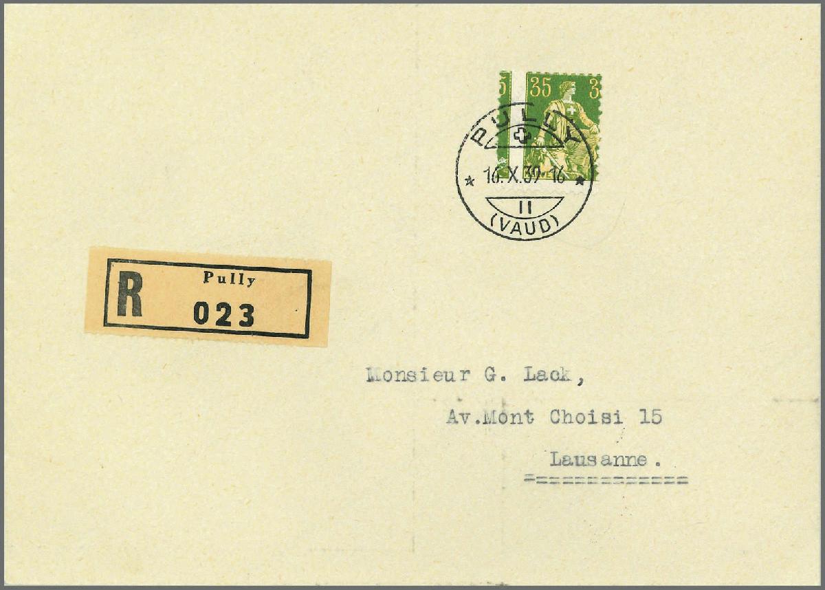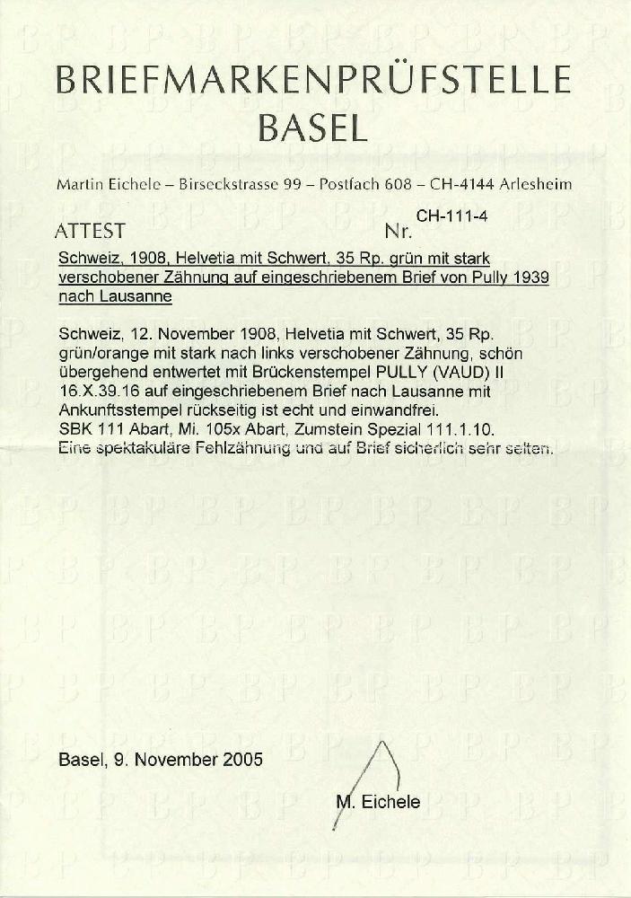 | Zusatzinformationen und Suchstichworte: | Rapp Auktion 2022 Auktionstermin: 2. - 7. Mai 2022 Los 261 Schweiz Freimarken nach 1907 35 Rp. grün/orange, stark nach links verschobene Zähnung, auf eingeschriebenem sauberen Brief von PULLY nach Lausanne. Eine markante und vor allem auf Brief seltene Abart! Attest Eichele. Zuschlag 500,00 CHF |
