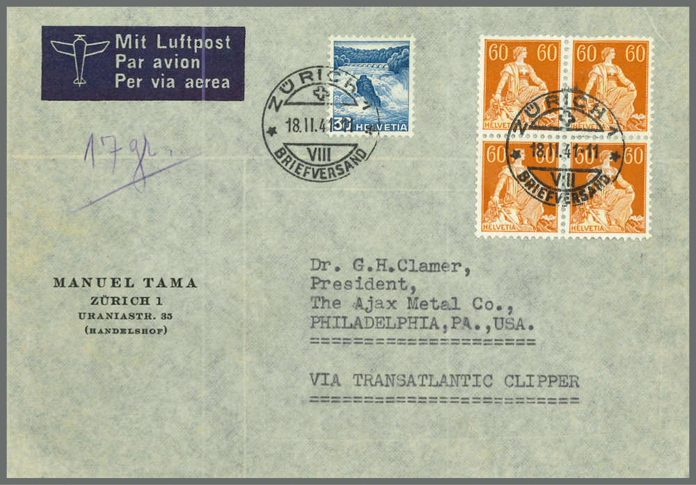 | Zusatzinformationen und Suchstichworte: | Rapp Auktion 2022 Auktionstermin: 2. - 7. Mai 2022 Los 265 Schweiz Freimarken nach 1907 60 Rp. braunorange/gelb, Kreidepapier, im zentrisch gestempelten Viererblock nebst Beifrankatur auf Portogerechtem Luftpost-Brief von Zürich nach Philadelphia/USA. Sehr gute Erhaltung. Attest Eichele. Zuschlag 260,00 CHF |