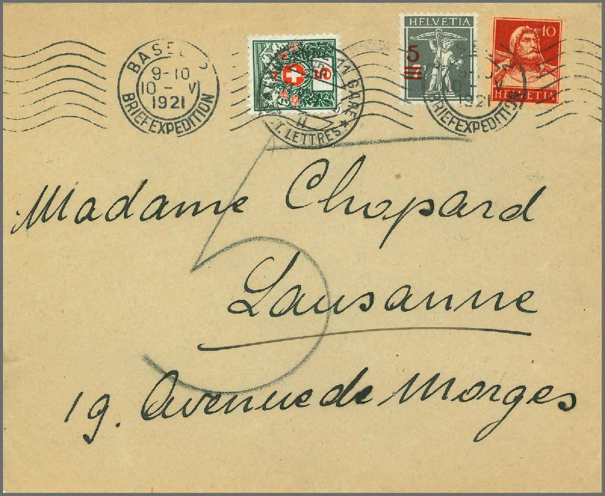 | Zusatzinformationen und Suchstichworte: | Rapp Auktion 2022 Auktionstermin: 2. - 7. Mai 2022 Los 280 Schweiz Freimarken nach 1907 5 auf 7 1/2 Rp. grau, Type III, zusammen mit Tell 10 Rp. rot mit Maschinenstempel Krone BASEL 2 auf vollständigem und sauber beschriftetem Umschlag nach Lausanne. Der Brief war mit 5 Rappen unterfrankiert, daher wurde bei der Ankunft in Lausanne das fehlende Porto mit 5 Rp. Alpenrose austaxiert. Bedarfsbriefe mit der 5 Rp. auf 7 1/2 Rp. in Type III sind allergrösste Raritäten. Atteste Renggli und Eichele. Der vorliegende Brief wurde letztmalig an der Rapp-Auktion 2002 versteigert. Zuschlag 4.000,00 CHF |