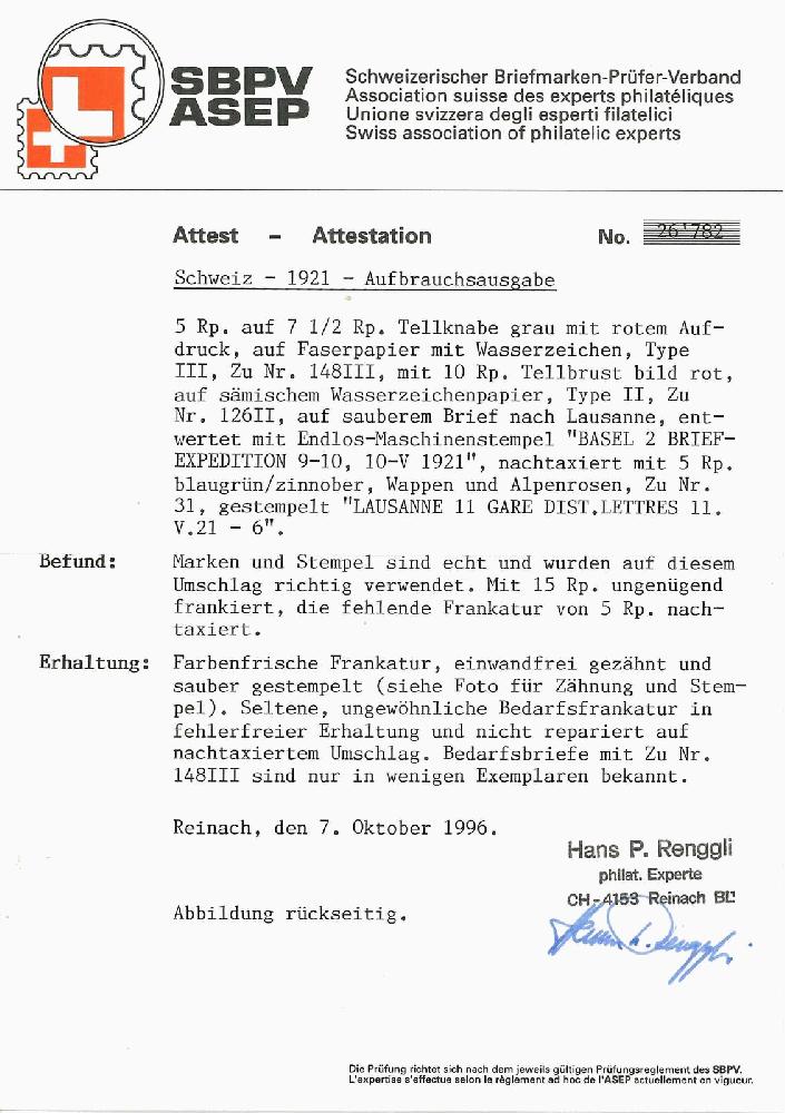 | Prüfer: | Renggli, Hans P. (SBPV / ASEP (Schweizerischer Briefmarken-Prüfer-Verband)) |