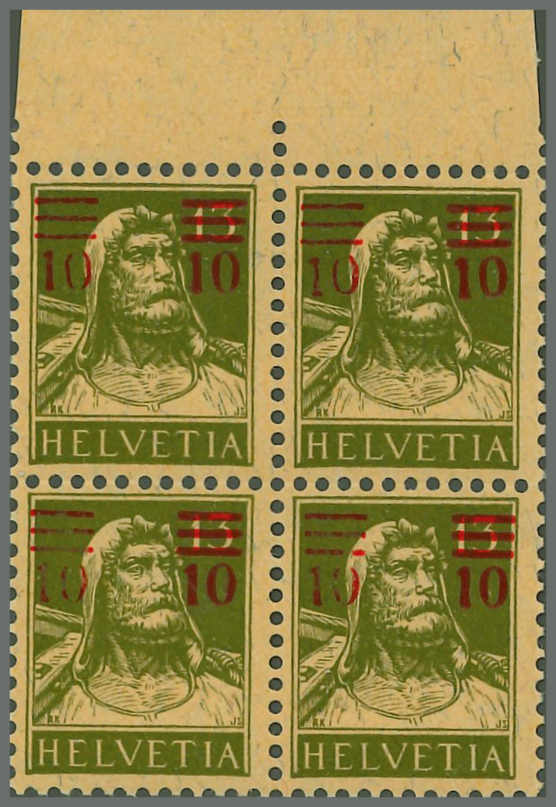 | Zusatzinformationen und Suchstichworte: | Rapp Auktion 2022 Auktionstermin: 2. - 7. Mai 2022 Los 286 Schweiz Freimarken nach 1907 10 auf 13 Rp. grünoliv, Aufdrucke links und rechts vom Tellkopf, tadellos postfrischer Viererblock mit oberem Bogenrand. Atteste Renggli und Eichele. Zuschlag 480,00 CHF |