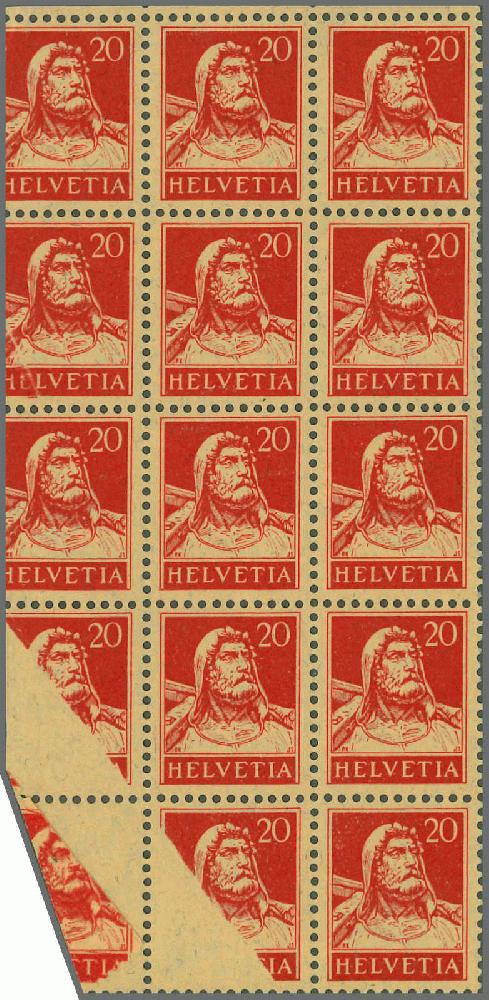 | Zusatzinformationen und Suchstichworte: | Rapp Auktion 2022 Auktionstermin: 2. - 7. Mai 2022 Los 291 Schweiz Freimarken nach 1907 20 Rp. karminrot, Blockstück mit 15 Marken, links unten fehlender Druck bzw. Druck auf Rückseite infolge umgelegter Papierbahn. In der mittleren senkrechten Reihe haben die oberste und unterste Marke sehr geringe Falzspuren, sonst alles postfrisch. Attarktive und seltene Abart. Attest Eichele. Zuschlag 700,00 CHF |