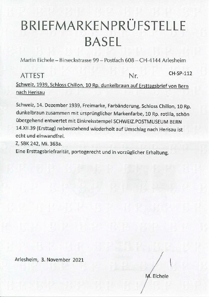 | Zusatzinformationen und Suchstichworte: | Rapp Auktion 2022 Auktionstermin: 2. - 7. Mai 2022 Los 334 Schweiz Freimarken nach 1907 10 Rp. dunkelbraun, zusammen mit 10 Rp. rotlila von der nachgravierten Platte auf qualitativ nicht zu übertreffendem, portogerechtem Ersttags-Brief mit klarem Stempel "SCHWEIZ.POSTMUSEUM BERN 14.XII.39". Ein typischer "Gaudard-Brief", laut Aufzeichnungen seines Sekretärs hat er lediglich 5 solche FDC's erstellt. Nach den symbolischen Bildern 1938/42 mit Abstand der seltenste DFC der Frei- und Werbemarken. Atteste Renggli und Eichele. Zuschlag 11.000,00 CHF |
