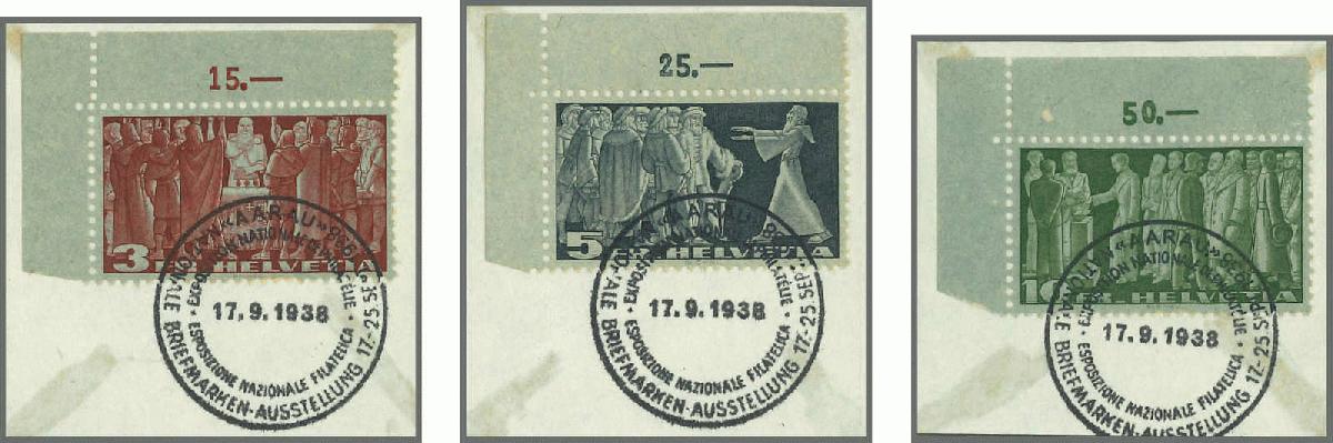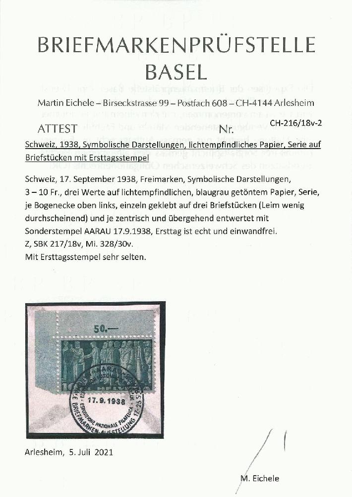 | Zusatzinformationen und Suchstichworte: | Rapp Auktion 2022 Auktionstermin: 2. - 7. Mai 2022 Los 341 Schweiz Freimarken nach 1907 3 Fr. bis 10 Fr. auf lichtempfindlichem Papier, der kpl. Satz jeweils aus den linken oberen Bogenecken auf Briefausschnitten mit klar ausgeprägtem Ersttag- Stempel vom 17.9.1938 (rückseitige Leimflecken leicht durchscheinend). Einheitlich mit Ersttag gestempelten Serien, zu dem auf grossen Briefausschnitten, sind äusserst selten. Attest Eichele. Zuschlag 2.200,00 CHF |