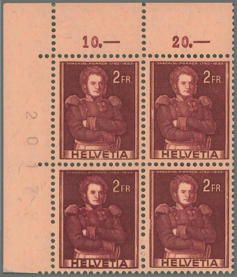| Zusatzinformationen und Suchstichworte: | Rapp Auktion 2022 Auktionstermin: 2. - 7. Mai 2022 Los 352 Schweiz Freimarken nach 1907 2 Fr. braun/rot, tadellos postfrischer Viererblock aus der linken oberen Bogenecke, die Marke links unten (Position 11 im Bogen) mit grosser Doppelprägung. Vor allem in Blockstücken ist diese Abart nicht häufig. Attest Eichele. Zuschlag 3.000,00 CHF |