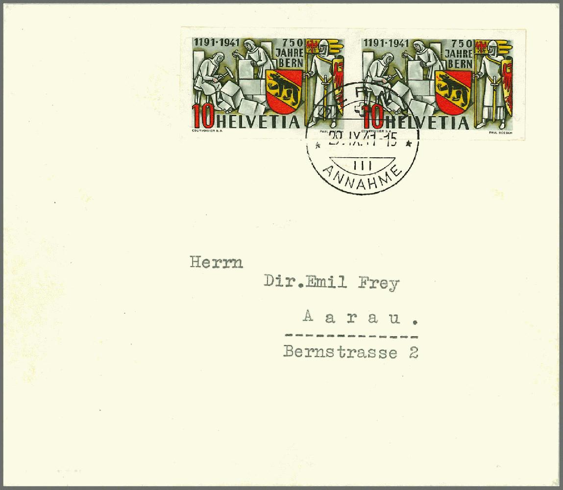 | Zusatzinformationen und Suchstichworte: | Rapp Auktion 2022 Auktionstermin: 2. - 7. Mai 2022 Los 357 Schweiz Freimarken nach 1907 10 Rp. mehrfarbig, waagrechtes Paar ungezähnt mit allseitig breiten Rändern auf attraktivem, portogerechtem Brief von BERN 29.IX.41 nach Aarau. Beste Erhaltung. Attest Liniger und Eichele. Zuschlag 2.400,00 CHF |