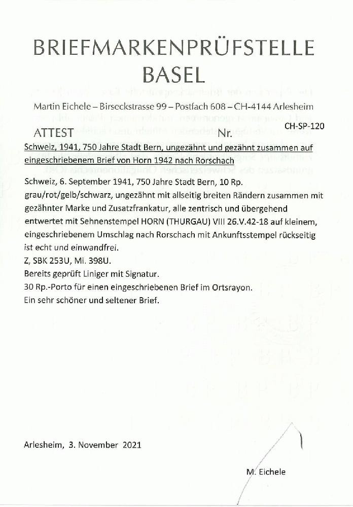 | Zusatzinformationen und Suchstichworte: | Rapp Auktion 2022 Auktionstermin: 2. - 7. Mai 2022 Los 358 Schweiz Freimarken nach 1907 10 Rp. mehrfarbig, ungezähnt und gezähnt nebst PJ-Beifrankatur auf portogerechtem eingeschreibenem Briefchen im Ortsrayon von HORN 26.V.42 nach Rorschach, rückseitig mit AK-Stempel. Frische und tadellose Erhaltung. Atteste Liniger und Eichele. Zuschlag 1.500,00 CHF |