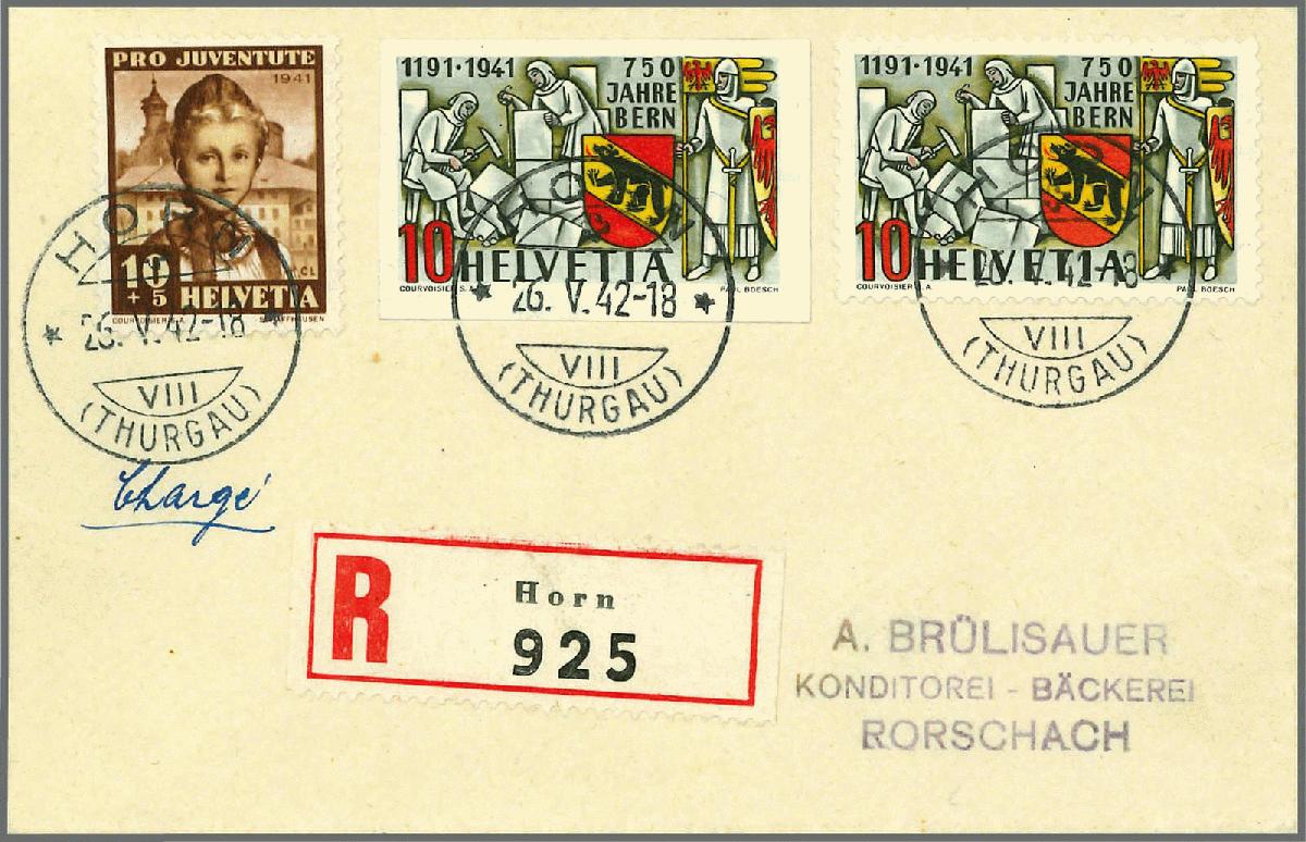 | Zusatzinformationen und Suchstichworte: | Rapp Auktion 2022 Auktionstermin: 2. - 7. Mai 2022 Los 358 Schweiz Freimarken nach 1907 10 Rp. mehrfarbig, ungezähnt und gezähnt nebst PJ-Beifrankatur auf portogerechtem eingeschreibenem Briefchen im Ortsrayon von HORN 26.V.42 nach Rorschach, rückseitig mit AK-Stempel. Frische und tadellose Erhaltung. Atteste Liniger und Eichele. Zuschlag 1.500,00 CHF |