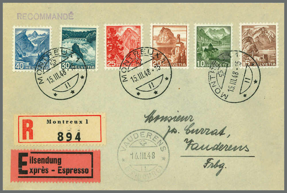 | Zusatzinformationen und Suchstichworte: | Rapp Auktion 2022 Auktionstermin: 2. - 7. Mai 2022 Los 371 Schweiz Freimarken nach 1907 Landschaften 1948: Der kpl. Satz auf schönem und sauberem Ersttags-Brief von Montreux nach Vauderens. Attest BP. Zuschlag 180,00 CHF |