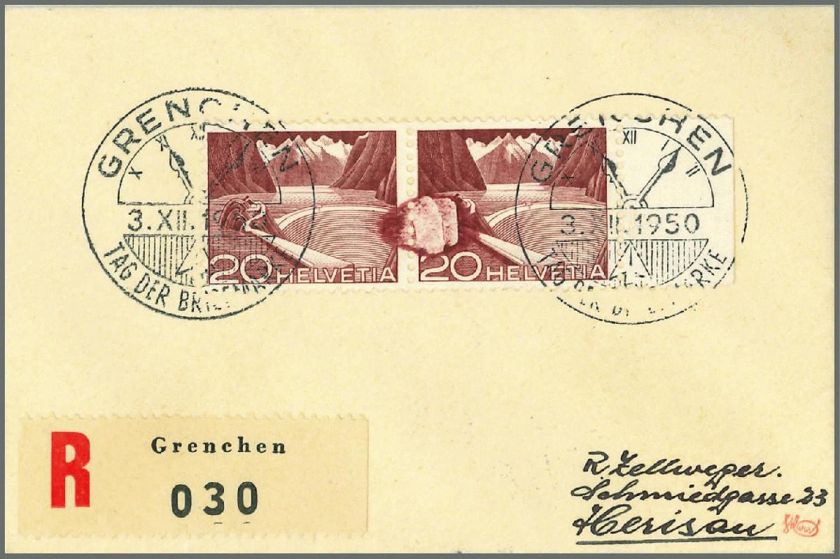 | Zusatzinformationen und Suchstichworte: | Rapp Auktion 2022 Auktionstermin: 2. - 7. Mai 2022 Los 374 Schweiz Freimarken nach 1907 20 Rp. braunkarmin, waagrechtes Paar mit rechtem Bogenrand, in der Mitte des Paares markanter, grosser, farbig umrandeter Fleck, mit Sonderstempel "GRENCHEN TAG DER BRIEFMARKE 3.XII.1950" portogerecht auf kleinformatigem Einschreibe-Briefchen nach Herisau. Diese Abart, vor allem auf zeitgerechten Briefen, sind ausserordentlich selten! Attest Moser. Ausruf 5.800,00 CHF |