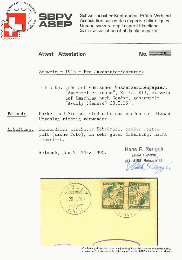 | Zusatzinformationen und Suchstichworte: | Rapp Auktion 2022 Auktionstermin: 2. - 7. Mai 2022 Los 415 Schweiz K/Z/S, Sammlungen, Lots und Posten Kehrdruck Juventute 1915, portogerecht auf sauber beschriftetem Umschlag von AVULLY 28.I.16 nach Genf. Einwandfreie Erhaltung. Atteste Renggli und Eichele. Zuschlag 260,00 CHF |