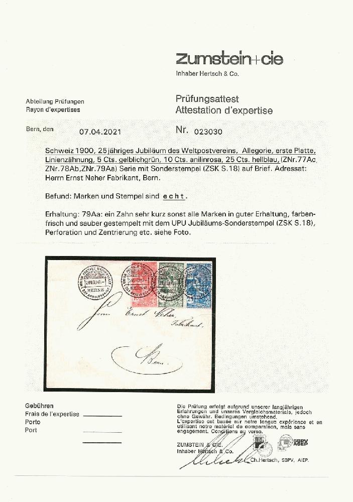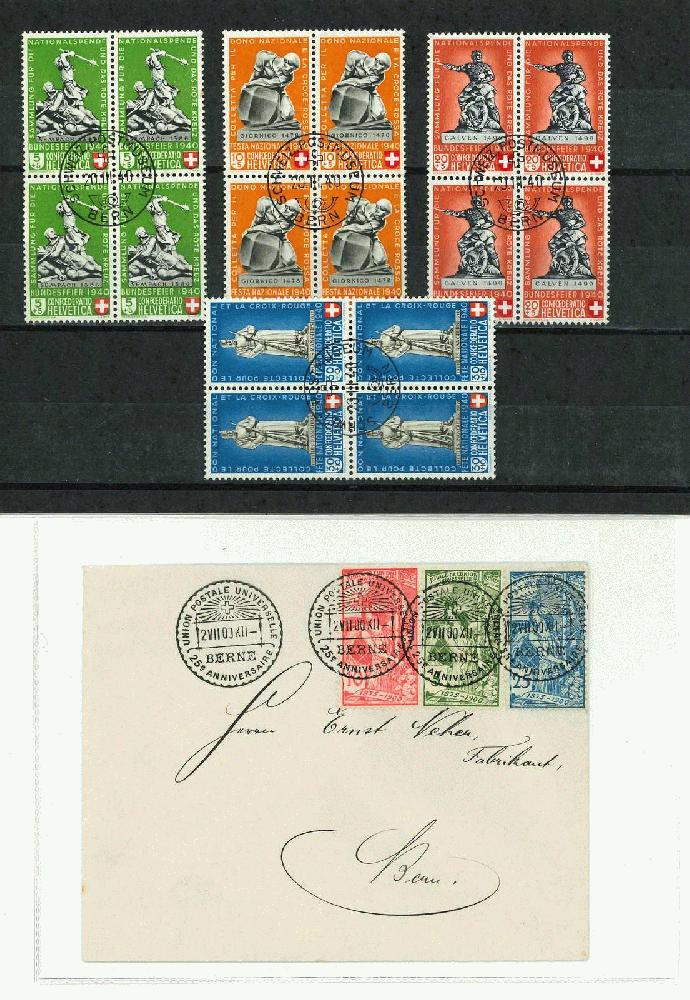 | Zusatzinformationen und Suchstichworte: | Rapp Auktion 2022 Auktionstermin: 2. - 7. Mai 2022 Los 685 Schweiz UPU 1900: Der kpl. Satz auf schönem Ersttags-Brief, leider hat die 25 Rp.-Marke rechts unten sehr kurzen Zahn (Attest Hertsch). Dazu Patria 1940 in Viererblöcken mit zentrischen ET-Stempeln BERN SCHWEIZ. POSTMUSEUM, alle Blöcke noch mit Gummi, teils aber mit geringen Stockpunkten. Bitte begutachten. Zuschlag 220,00 CHF |