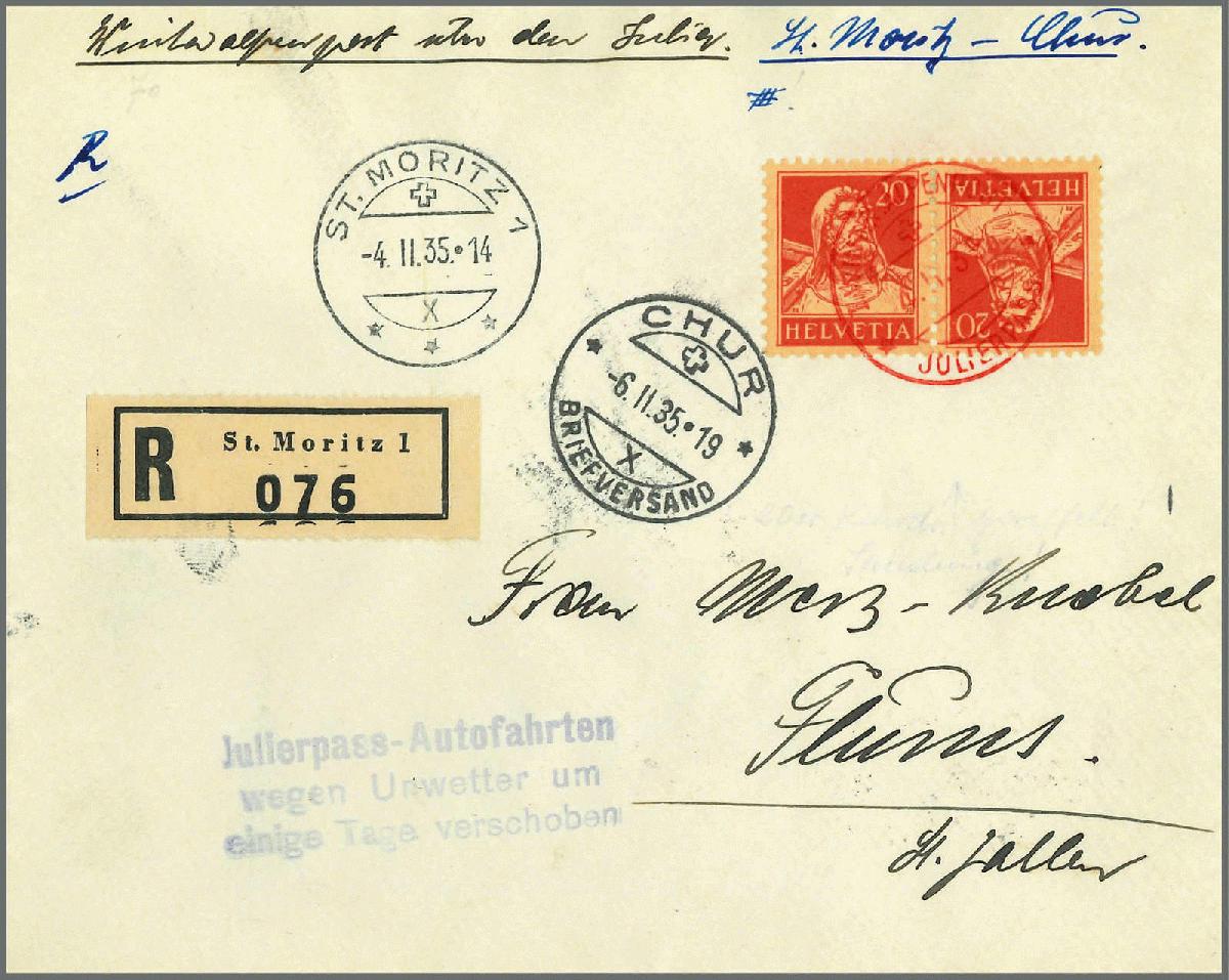 | Zusatzinformationen und Suchstichworte: | Rapp Auktion 2022 Auktionstermin: 2. - 7. Mai 2022 Los 418 Schweiz K/Z/S, Sammlungen, Lots und Posten 20 Rp. rot, geriffeltes Papier, mit rotem Vollstempel I. WINTERALPENPOST JULIERPASS 4.II.35 auf Einschreibe-Brief von St. Moritz nach Chur und Flums, rückseitig mit Ankunftstempel. Der Kehrdruck wurde zwecks Kontrolle gelöst und mit Falz wieder befestigt. Ein seltener und attraktiver Brief. Attest Eichele. Zuschlag 750,00 CHF |