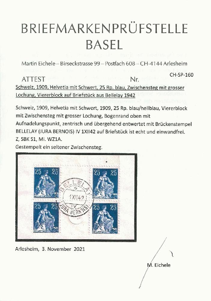 | Zusatzinformationen und Suchstichworte: | Rapp Auktion 2022 Auktionstermin: 2. - 7. Mai 2022 Los 424 Schweiz K/Z/S, Sammlungen, Lots und Posten 25 Rp. blau, 2 Zwischensteg-Paare im Blockstück auf Briefausschnitt mit zentrischem Stempel BELLALAY 1 XII 42. Tadellose Erhaltung. Atteste Liniger und Eichele. Zuschlag 600,00 CHF |