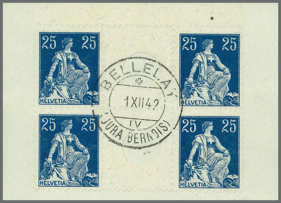 | Zusatzinformationen und Suchstichworte: | Rapp Auktion 2022 Auktionstermin: 2. - 7. Mai 2022 Los 424 Schweiz K/Z/S, Sammlungen, Lots und Posten 25 Rp. blau, 2 Zwischensteg-Paare im Blockstück auf Briefausschnitt mit zentrischem Stempel BELLALAY 1 XII 42. Tadellose Erhaltung. Atteste Liniger und Eichele. Zuschlag 600,00 CHF |