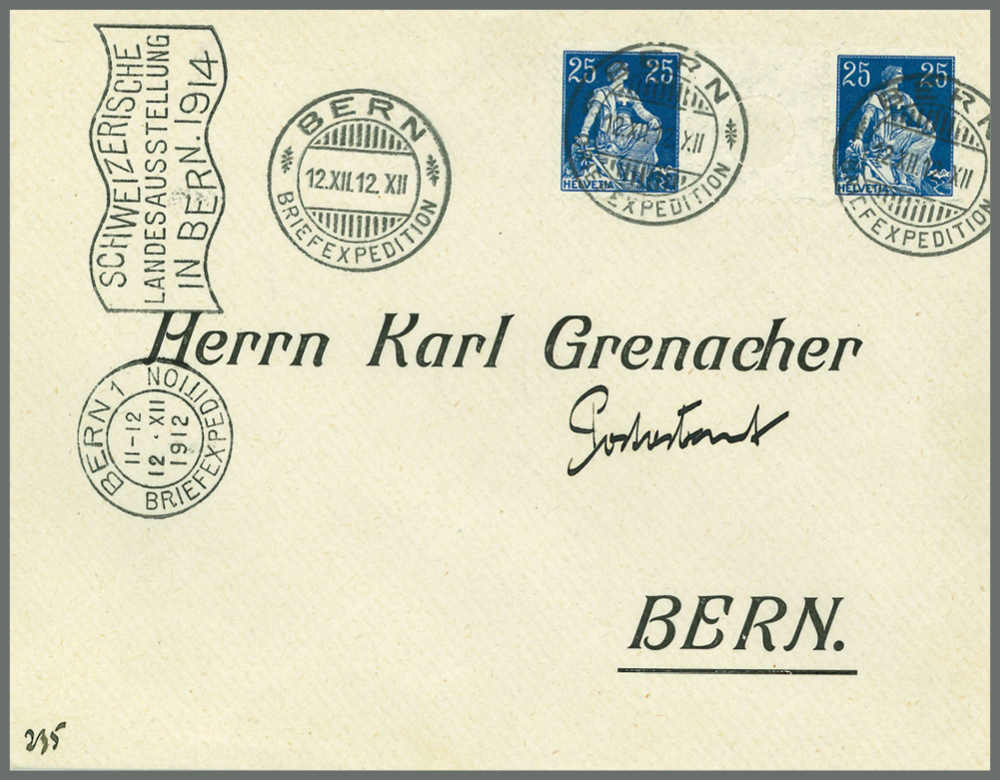 | Zusatzinformationen und Suchstichworte: | Rapp Auktion 2022 Auktionstermin: 2. - 7. Mai 2022 Los 425 Schweiz K/Z/S, Sammlungen, Lots und Posten 25 Rp. blau, Zwischensteg auf sehr schönem Ortsbrief von BERN 12.XII.12.XII und zusätzlichem Sonderstempel der Landesausstellung. Atteste Liniger und Marchand. Zuschlag 420,00 CHF |