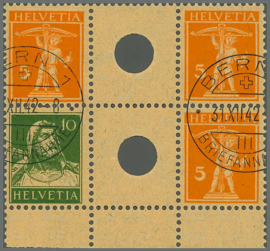 | Zusatzinformationen und Suchstichworte: | Rapp Auktion 2022 Auktionstermin: 2. - 7. Mai 2022 Los 441 Schweiz K/Z/S, Sammlungen, Lots und Posten 5 Rp. rotorange und 10 Rp. grün/5 Rp. rotorange, 2 Zwischensteg-Paare im Blockstück mit unterem Bogenrand und klaren Stempeln BERN 1 31.XII.42, noch mit Gummi. Es sind lediglich ein paar solche gestempelte Einheiten bekannt, daher eine Rarität ersten Ranges! Atteste Liniger, Rellstab und Eichele. Zuschlag 27.000,00 CHF |