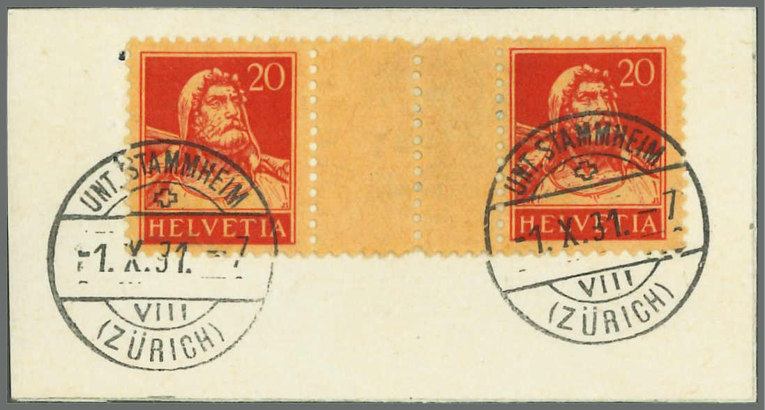 | Zusatzinformationen und Suchstichworte: | Rapp Auktion 2022 Auktionstermin: 2. - 7. Mai 2022 Los 452 Schweiz K/Z/S, Sammlungen, Lots und Posten 20 Rp. + 20 Rp. rot, geriffeltes Papier, mit Falz befestigt auf dazugehörendem Briefstück mit übergehendem Stempel UNT.STAMMHEIM 1.X.31-7. Tadellose und sehr saubere Erhaltung. Laut Attest Liniger wurde das Ausgabedatum dieses Zwischensteges nicht registriert, laut Ernst Müller in seinem KZS-Büchlein von 1954 gelangte dieser Zwischensteg erst 1933 an die Postschalter. Der Experte Marchand bestätigt das Attest von Liniger. Zuschlag 1.900,00 CHF |