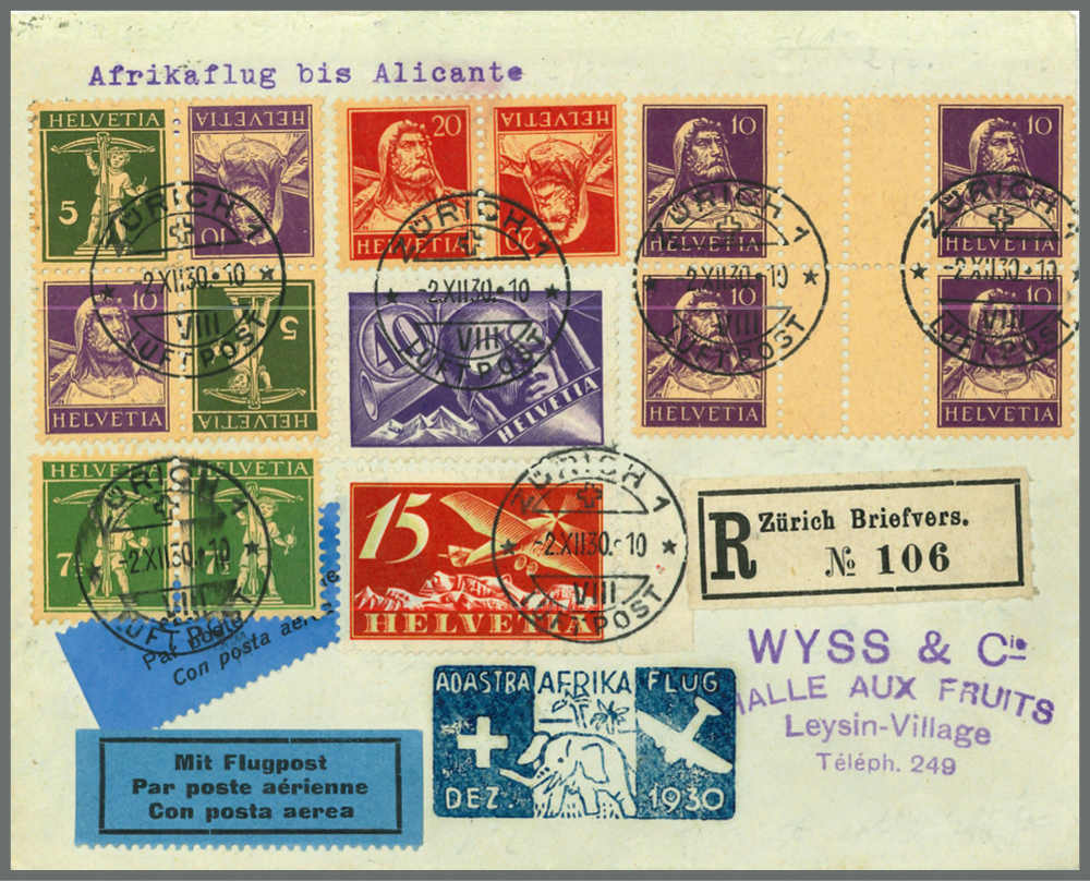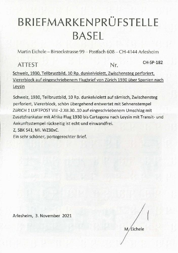 | Zusatzinformationen und Suchstichworte: | Rapp Auktion 2022 Auktionstermin: 2. - 7. Mai 2022 Los 455 Schweiz K/Z/S, Sammlungen, Lots und Posten 10 Rp. dunkelviolett, 2 Zwischensteg-Paare im Blockstück, zusammen mit attraktiven Beifrankaturen, portogerecht per Einschreiben für den Afrika-Flug 1930 nach Cartagena. Ein sehr schöner und guter Brief. Attest Eichele. Zuschlag 160,00 CHF |