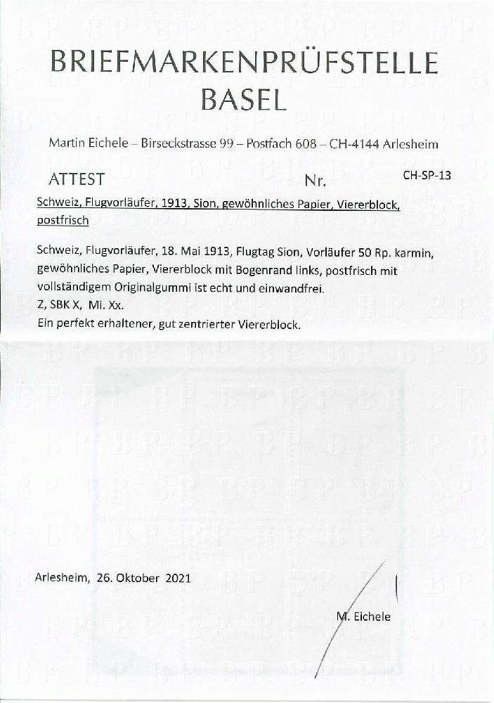 | Zusatzinformationen und Suchstichworte: | Rapp Auktion 2022 Auktionstermin: 2. - 7. Mai 2022 Los 475 Schweiz Flugpostmarken SITTEN, gewöhnliches Papier, tadellos postfrischer Viererblock mit linkem Bogenrand. Attest Eichele. PF 9.X = 4'800.-. Zuschlag 3.400,00 CHF |