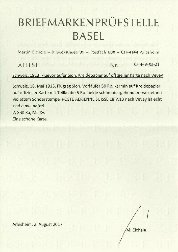 | Zusatzinformationen und Suchstichworte: | Rapp Auktion 2022 Auktionstermin: 2. - 7. Mai 2022 Los 478 Schweiz - Pionierflüge (PF) Sitten, Glanzpapier, auf offizieller Karte (POUR LA PATRIE) nach Vevey. Saubere und tadellose Erhaltung. Attest Eichele. PF 9 Xa. Zuschlag 850,00 CHF |