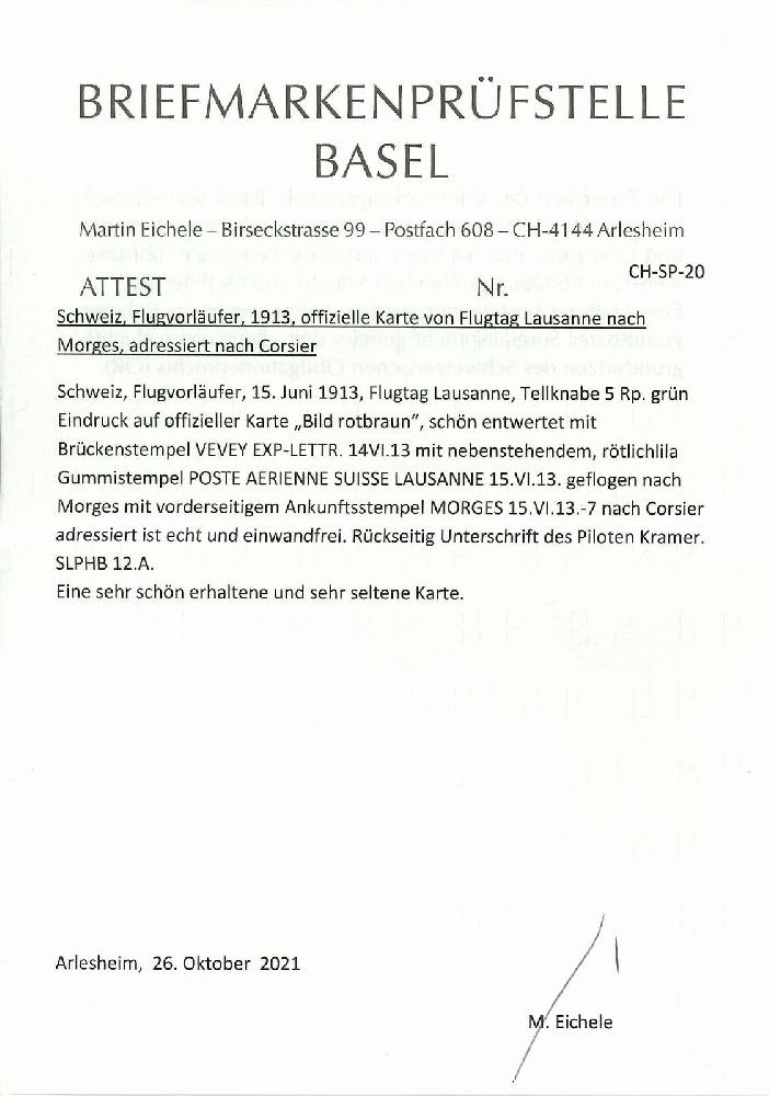 | Zusatzinformationen und Suchstichworte: | Rapp Auktion 2022 Auktionstermin: 2. - 7. Mai 2022 Los 483 Schweiz - Pionierflüge (PF) Flugtag LAUSANNE: Offizielle Postkarte mit Flugzeug befördert von Villeneuve nach Ouchy und anschliessend von Lausanne nach Morges. Tadellos erhaltene Karte mit Aufgabestempel VEVEY 14.VI.13, rückseitig Unterschrift des Piloten "Kramer". LPHB 6'000.-. PF 12.A. Zuschlag 600,00 CHF |