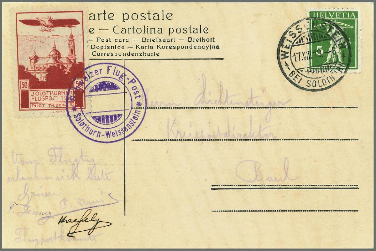 | Zusatzinformationen und Suchstichworte: | Rapp Auktion 2022 Auktionstermin: 2. - 7. Mai 2022 Los 487 Schweiz Flugpostmarken SOLOTHURN, auf offizieller Karte (Th. Borrer mit 2-plätzigem Monoplan) nach Basel. Tadellose und saubere Erhaltung. Attest Rellstab. PF 14.B = 2'800.-. Zuschlag 900,00 CHF |
