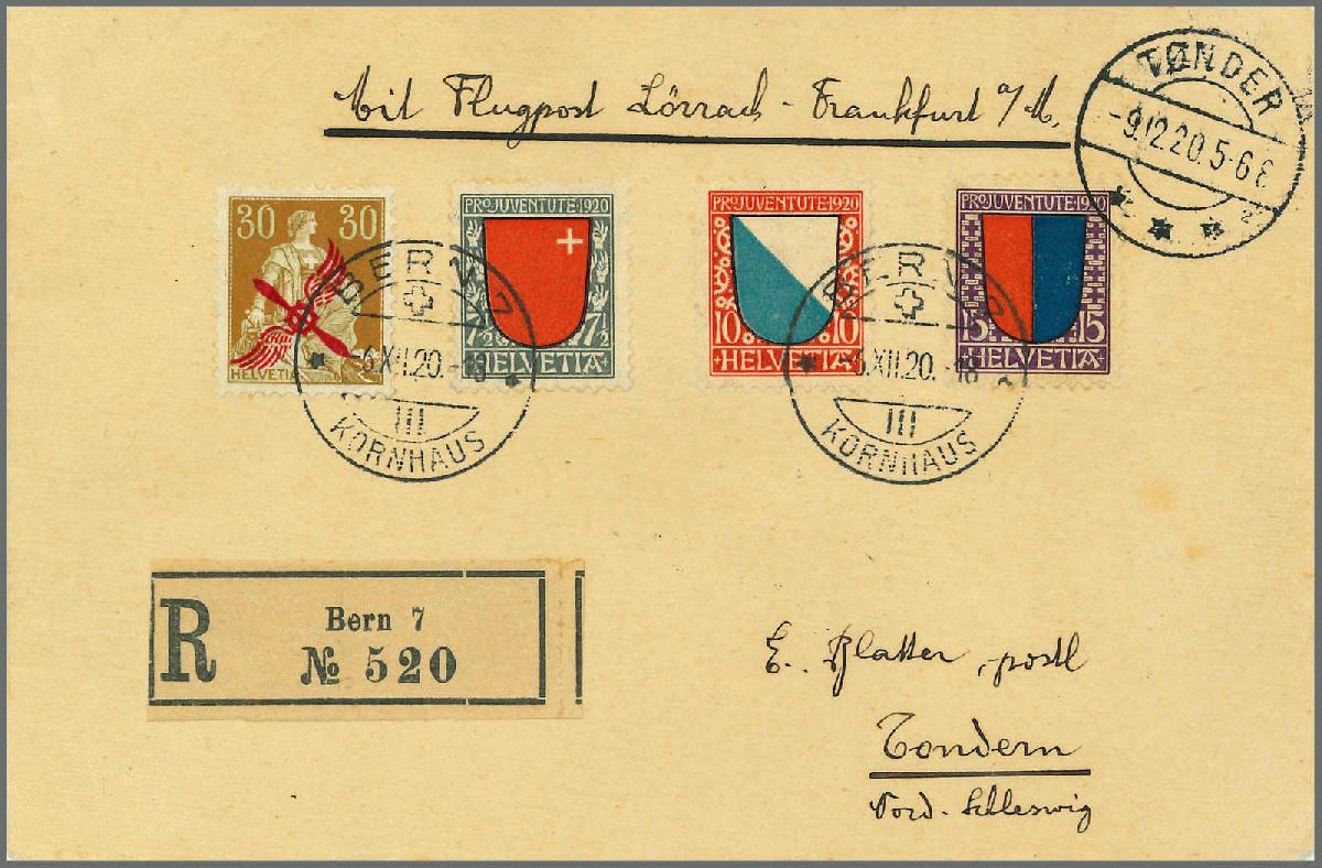 | Zusatzinformationen und Suchstichworte: | Rapp Auktion 2022 Auktionstermin: 2. - 7. Mai 2022 Los 494 Schweiz Flugpostmarken 30 Rp. braun mit Zusatz-Frankatur Juventute 1920 auf eingeschriebenem "Blatter-Brief" von Bern nach Tondern/Dänemark. Ein Nachweis der Beförderung auf der Fluglinie Lörrach-Frankfurt ist nicht möglich. Trotzdem ein attraktiver und seltener Brief. Atteste Renggli und Eichele. Zuschlag 1.100,00 CHF |