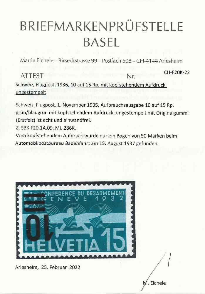 | Zusatzinformationen und Suchstichworte: | Rapp Auktion 2022 Auktionstermin: 2. - 7. Mai 2022 Los 508 Schweiz Flugpostmarken 10 auf 15 Rp. grün, Aufdruck kopfstehend, ungebraucht mit sauberem Erstfalz. Attest Eichele. Zuschlag 950,00 CHF |