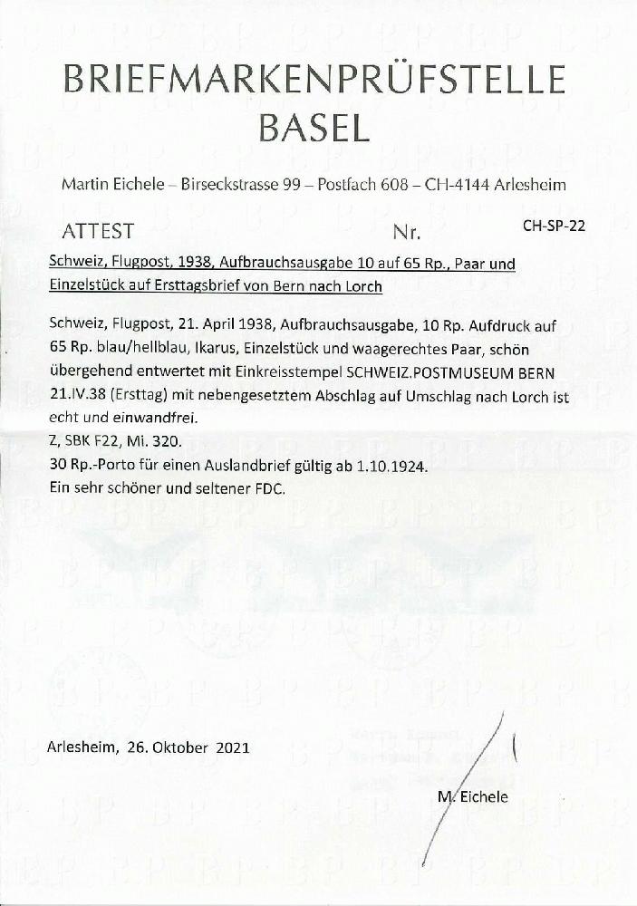 | Zusatzinformationen und Suchstichworte: | Rapp Auktion 2022 Auktionstermin: 2. - 7. Mai 2022 Los 510 Schweiz Flugpostmarken 10 auf 65 Rp. blau/graublau, 3 Exemplare zusammen auf portogerechtem Ersttags-Brief von BERN 21.IV.38 nach Lorch/Deutschland. Atteste Liniger und Eichele Zuschlag 1.500,00 CHF |