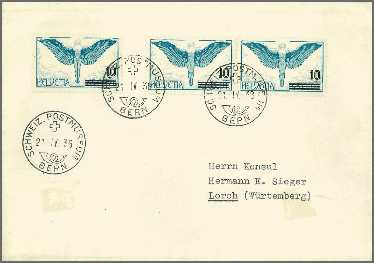 | Zusatzinformationen und Suchstichworte: | Rapp Auktion 2022 Auktionstermin: 2. - 7. Mai 2022 Los 510 Schweiz Flugpostmarken 10 auf 65 Rp. blau/graublau, 3 Exemplare zusammen auf portogerechtem Ersttags-Brief von BERN 21.IV.38 nach Lorch/Deutschland. Atteste Liniger und Eichele Zuschlag 1.500,00 CHF |