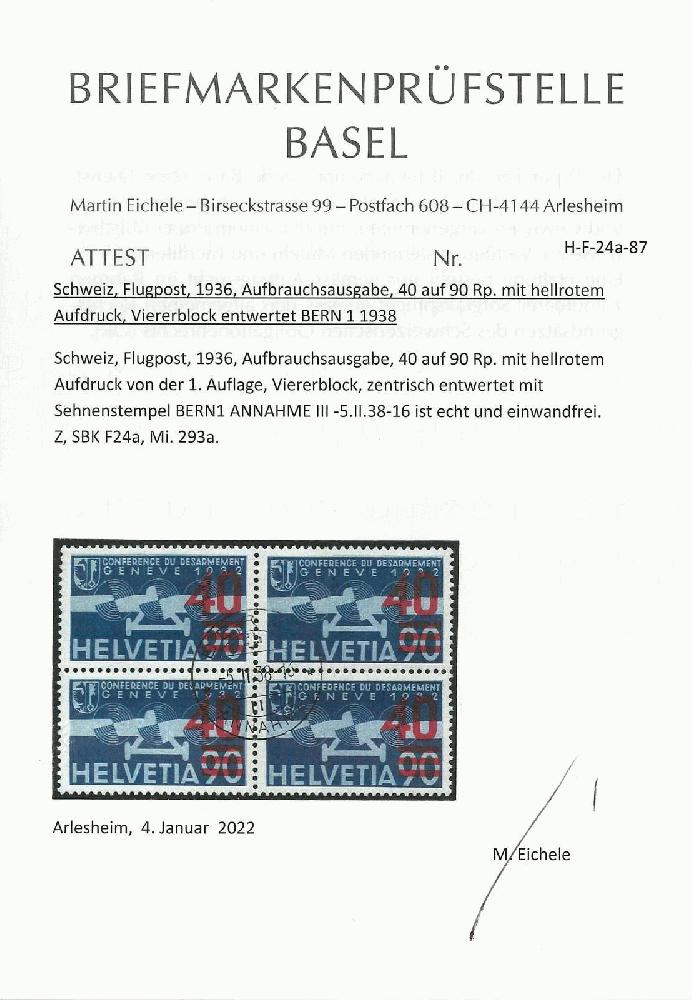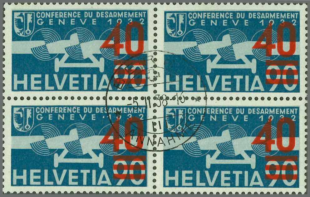| Zusatzinformationen und Suchstichworte: | Rapp Auktion 2022 Auktionstermin: 2. - 7. Mai 2022 Los 512 Schweiz Flugpostmarken 40 auf 90 Rp. blau, Aufdruck hellrot, tadelloser Viererblock mit Zentrum-Stempel BERN 5.II.38, noch mit Gummi. Attest Eichele. Zuschlag 800,00 CHF |