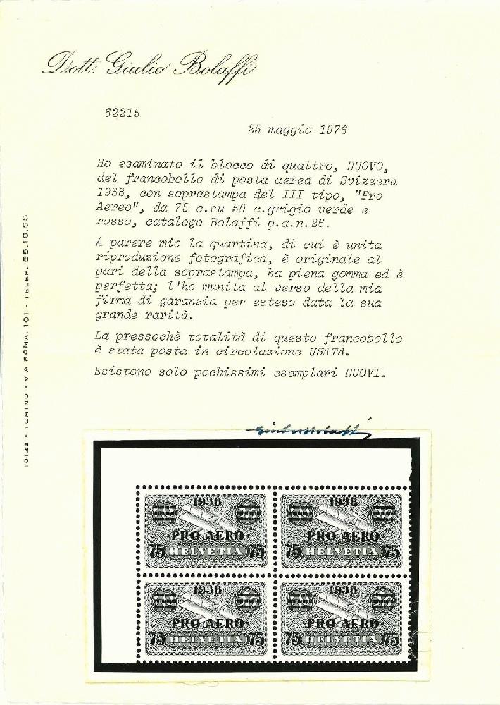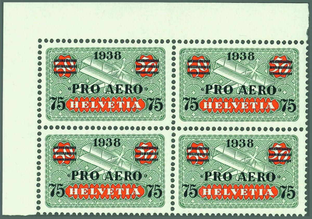 | Zusatzinformationen und Suchstichworte: | Rapp Auktion 2022 Auktionstermin: 2. - 7. Mai 2022 Los 518 Schweiz Flugpostmarken Pro Aero 1938, ungefalteter Viererblock aus der linken oberen Bogenecke in tadellos postfrischer Erhaltung, Falzspuren lediglich auf dem oberen Bogenrand. Atteste Bolaffi und Weid/Marchand. Zuschlag 27.000,00 CHF |