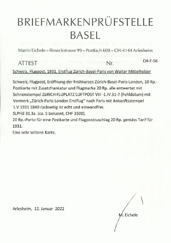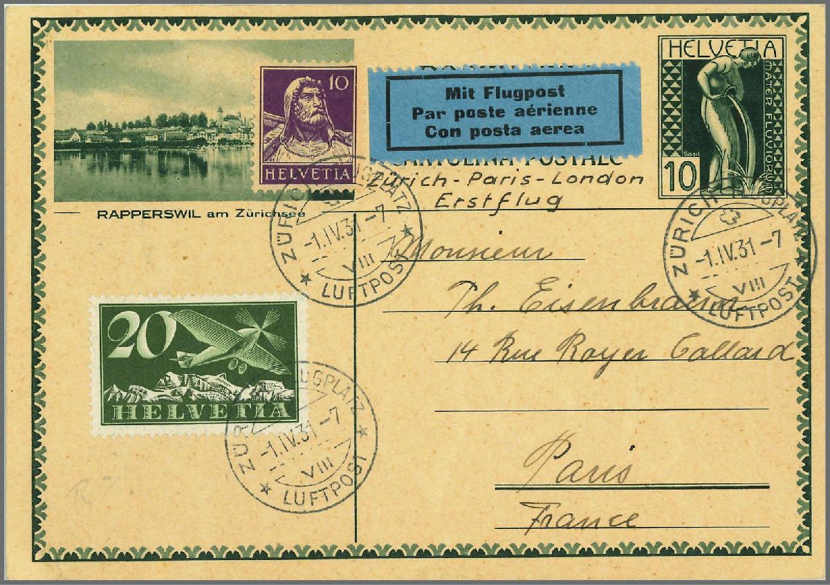 | Zusatzinformationen und Suchstichworte: | Rapp Auktion 2022 Auktionstermin: 2. - 7. Mai 2022 Los 524 Schweiz Flugpostmarken Erstflug Zürich-Paris von Walter Mittelholzer am 1.V.1931 (Fehldatum im Stempel 1.IV.31). Sehr schöne Bildpost-Karte nach Paris, rückseitig mit AK-Stempel. Nur 5 Belege wurden befördert. Attest Eichele. RF 31.3a Zuschlag 1.200,00 CHF |