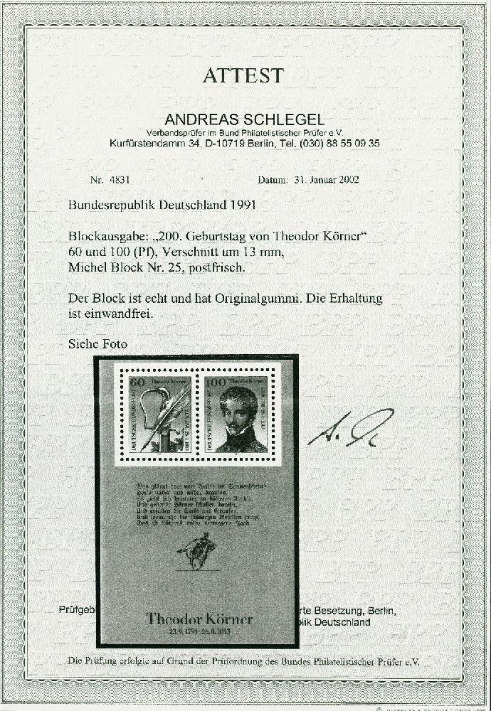 | Zusatzinformationen und Suchstichworte: | Hettinger 60. Auktion Auktionstermin: 4. August 2022 Los 2013 Bundesrepublik Deutschland Theodor Körner 1991, markant verschnittener Block (Überschrift unten statt oben), tadellos postfrisch, Attestkopie Schlegel BPP, selten angeboten, im Michel-Handbuch "Blocks und Kleinbogen Deutschland" katalogisiert und mit 300,- bewertet (6639) Ausruf 30,00 EUR |