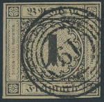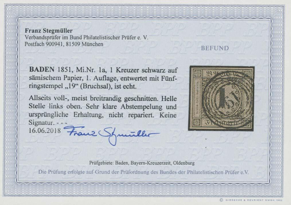 | Zusatzinformationen und Suchstichworte: | Ulrich Felzmann 175. Auktion Auktionstermin: 30. Juni 2022 Los 5002 Altdeutschland Baden 1 Kr Erstauflage auf sämischem Papier, farbfrische, allseits voll- bis meist breitrandige Marke mit sehr klar aufgesetztem Fünfringstempel "19" - BRUCHSAL, helle Stelle links oben, sonst gut, Fotokurzbefund Stegmüller BPP Zuschlag 135,00 EUR |