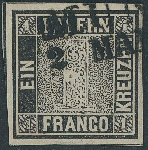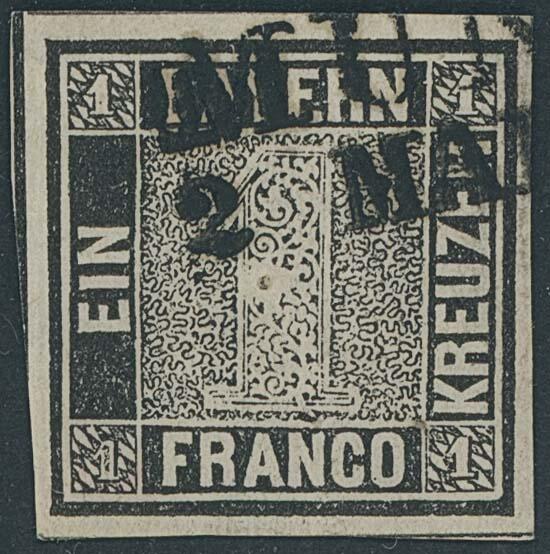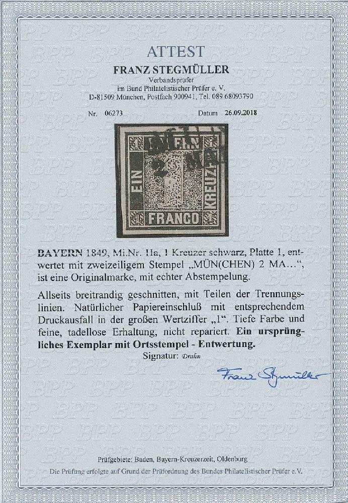 | Zusatzinformationen und Suchstichworte: | Ulrich Felzmann 175. Auktion Auktionstermin: 30. Juni 2022 Los 5011 Altdeutschland Bayern 1 Kr schwarz, Platte 1, farbtief und ringsum breitrandig mit dreiseitig Teilen der Trennungslinien, bemerkenswert ein zentraler markanter Druckausfall durch natürlichen Papiereinschluss in der großen Wertziffer "1", der noch dazu aufgrund des klaren Teil-L2 von MÜNCHEN bestens zur Wirkung kommt, sign. Drahn sowie Fotoattest Stegmüller BPP "... tadellose Erhaltung ... Ein ursprüngliches Exemplar mit Ortsstempel-Entwertung" Zuschlag 1.350,00 EUR |