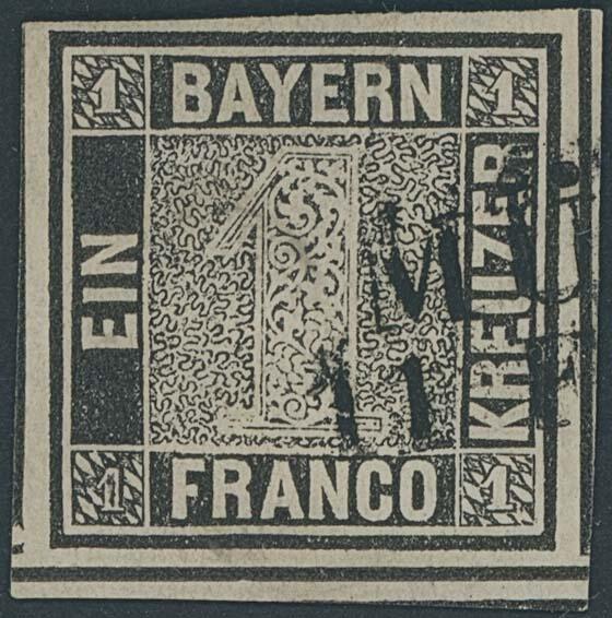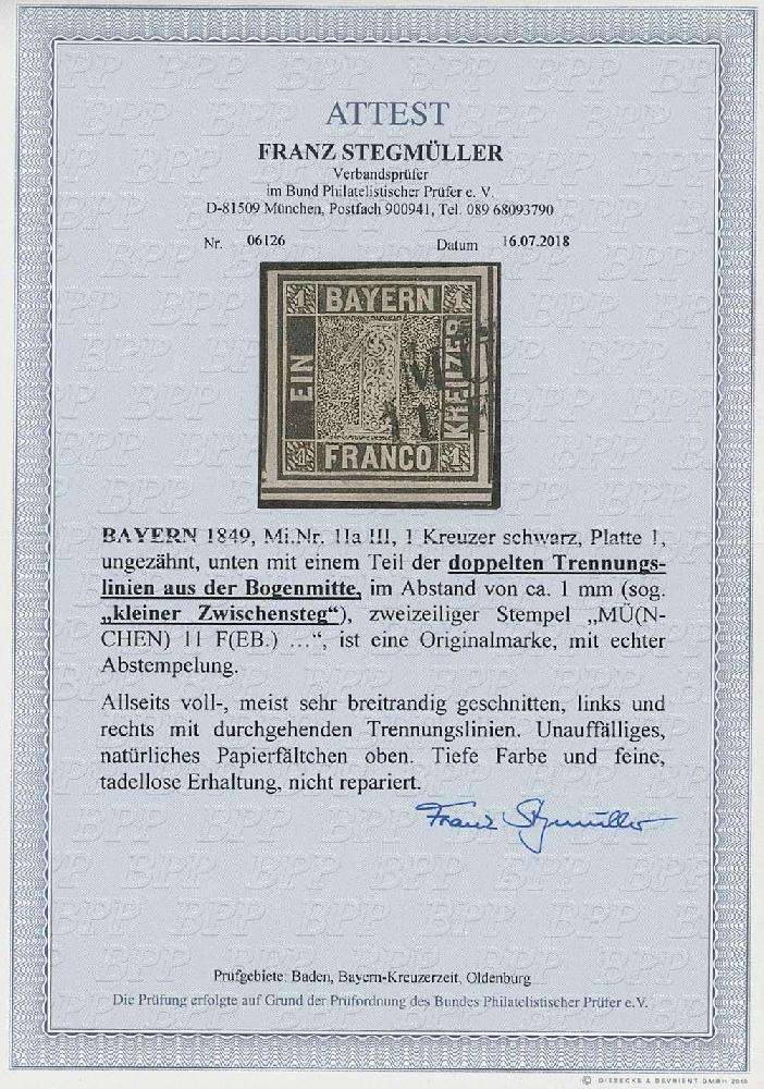 | Zusatzinformationen und Suchstichworte: | Ulrich Felzmann 175. Auktion Auktionstermin: 30. Juni 2022 Los 5012 Altdeutschland Bayern 1 Kr schwarz, Platte 1, ringsum voll- bis überrandig geschnitten mit beiderseits durchgehenden Trennungslinien sowie unten Teil der doppelten Trennungslinie aus der Bogenmitte als sogenannter "kleiner Zwischensteg", oben mit natürlichem Papierfältchen, insgesamt tadellos erhaltenes, farbintensives Renommierstück der ersten deutschen Briefmarke, sehr schön entwertet mit Teil-L2 MÜNCHEN, Fotoattest Stegmüller BPP, € 5.000,- Ausruf 2.000,00 EUR |