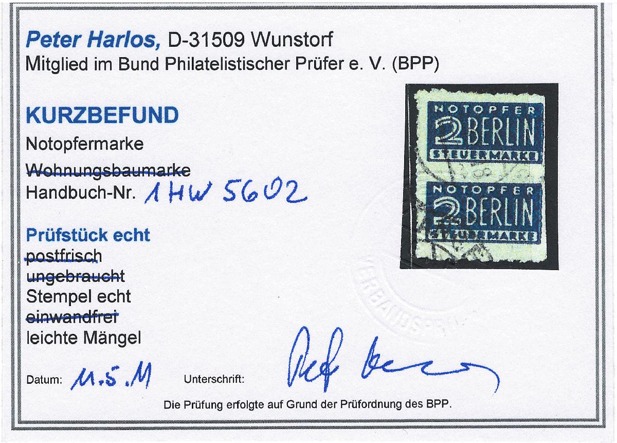 | KatalogNr: | Postmeister- und Privattrennungen Notopfer / Wohnungsbaumarken 1 HW 5602 A |