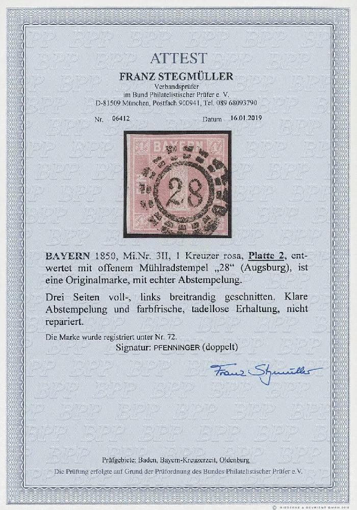 | Zusatzinformationen und Suchstichworte: | Ulrich Felzmann 175. Auktion Auktionstermin: 30. Juni 2022 Los 5016 Altdeutschland Bayern 1 Kr rosa, seltene Platte 2 mit spitzen Ecken, farbfrisch und ringsum voll- bis breitrandig mit ideal zentrisch, klar und gerade aufsitzendem oMr "28" - AUGSBURG in fehlerfreier Kabinetterhaltung! Doppelt sign. Pfenninger sowie Fotoatteste Schmitt und Stegmüller BPP (Reg. No. 72) Ausruf 1.200,00 EUR |