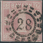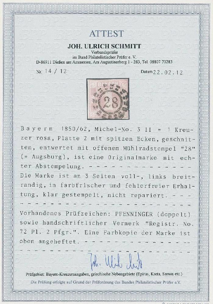 | Zusatzinformationen und Suchstichworte: | Ulrich Felzmann 175. Auktion Auktionstermin: 30. Juni 2022 Los 5016 Altdeutschland Bayern 1 Kr rosa, seltene Platte 2 mit spitzen Ecken, farbfrisch und ringsum voll- bis breitrandig mit ideal zentrisch, klar und gerade aufsitzendem oMr "28" - AUGSBURG in fehlerfreier Kabinetterhaltung! Doppelt sign. Pfenninger sowie Fotoatteste Schmitt und Stegmüller BPP (Reg. No. 72) Ausruf 1.200,00 EUR |