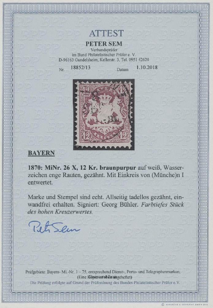 | Zusatzinformationen und Suchstichworte: | Ulrich Felzmann 175. Auktion Auktionstermin: 30. Juni 2022 Los 5025 Altdeutschland Bayern 12 Kr braunpurpur "enge Rauten", tieffarbiges, allseits vollzähniges Kabinettstück mit Einkreisstempel aus MÜNCHEN I, Fotoattest Sem BPP, € 1.400,- Ausruf 400,00 EUR |