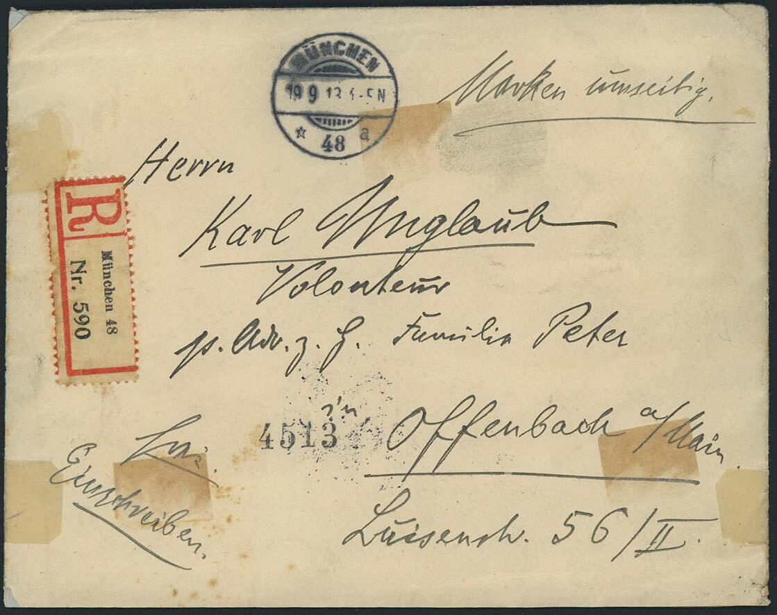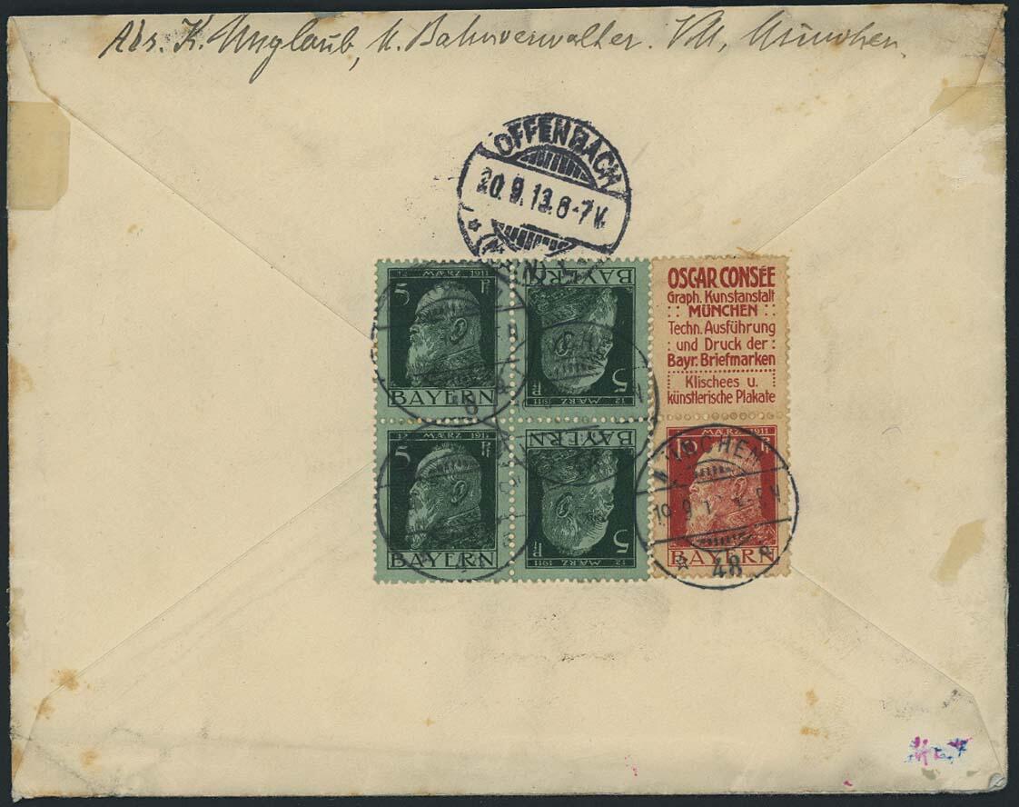 | Zusatzinformationen und Suchstichworte: | Ulrich Felzmann 175. Auktion Auktionstermin: 30. Juni 2022 Los 5031 Altdeutschland Bayern OSCAR CONSÉE + 10 Pfg Luitpold senkrecht, zusammen mit zweimal 5 Pfg Kehrdruck im Viererblock in reiner Zusammendruck-MiF rs. auf etwas fleckigem R-Brief MÜNCHEN 19.9.13, Falzreste auf Brief-Vorderseite, nach Offenbach (Main) mit Ank.-Stempel, normal gezähnt in fehlerloser Erhaltung inklusive zugehörigem Posteinlieferungsschein, Fotoattest Helbig BPP Ausruf 200,00 EUR |